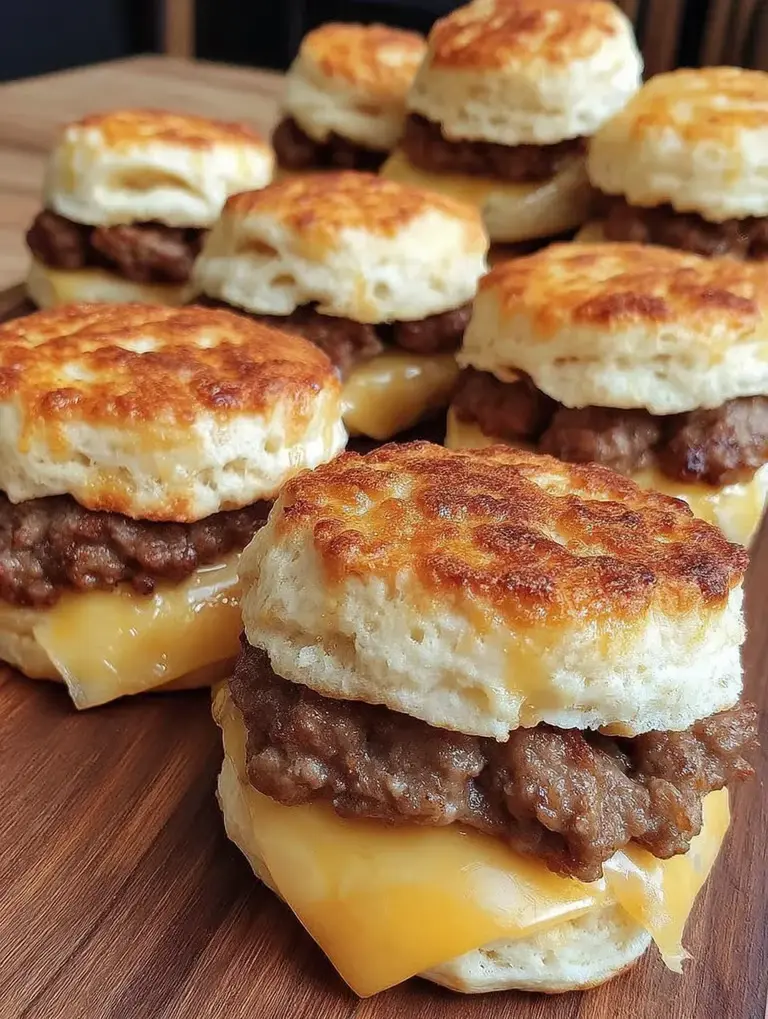 Place a sausage patty on the bottom half of each biscuit, adding a slice of cheddar or American cheese if desired. The warmth of the biscuit and sausage will melt the cheese perfectly. Top with the other biscuit half, and serve immediately while everything is hot, and the biscuits are at their fluffiest.